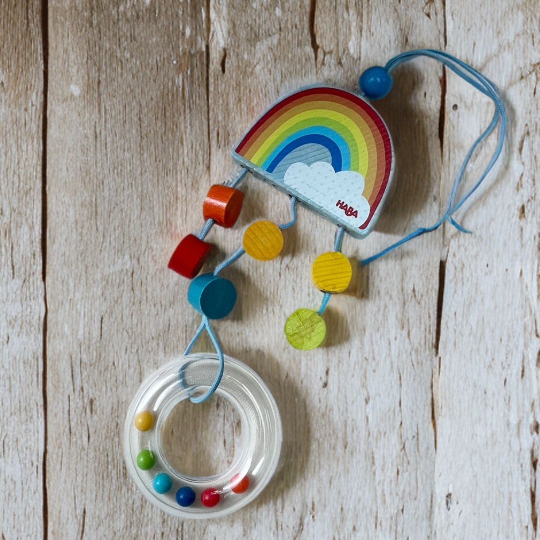 The Haba Rainbow Mobile is a colorful and engaging toy designed for infants. Hangs from a crib or play area, gently swaying to stimulate visual and auditory senses.